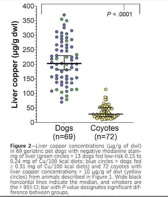 - “This study compared liver copper accumulation in 104 pet dogs to 88 free-foraging coyotes using coyotes as a surrogate for a canine species NOT consuming Cu fortified diets. The difference was staggering.”