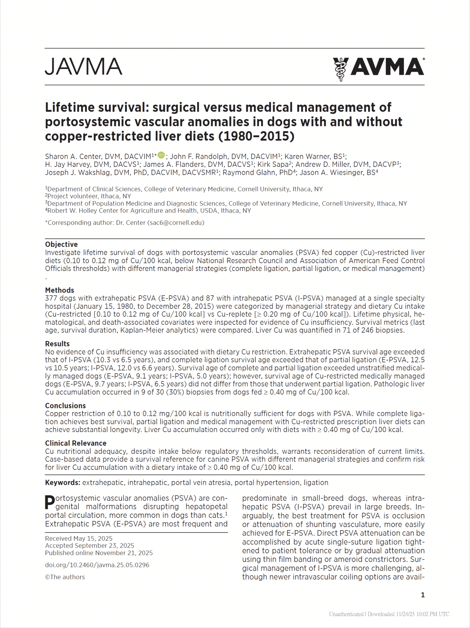 The three studies, now published in JAVMA – each as “open access” – extend her work, examining liver copper accumulation across typical pet dog populations, comparing liver copper accumulation in dogs to coyotes, and evaluating impact of low-copper diets on lifetime survival and health indicators in dogs.